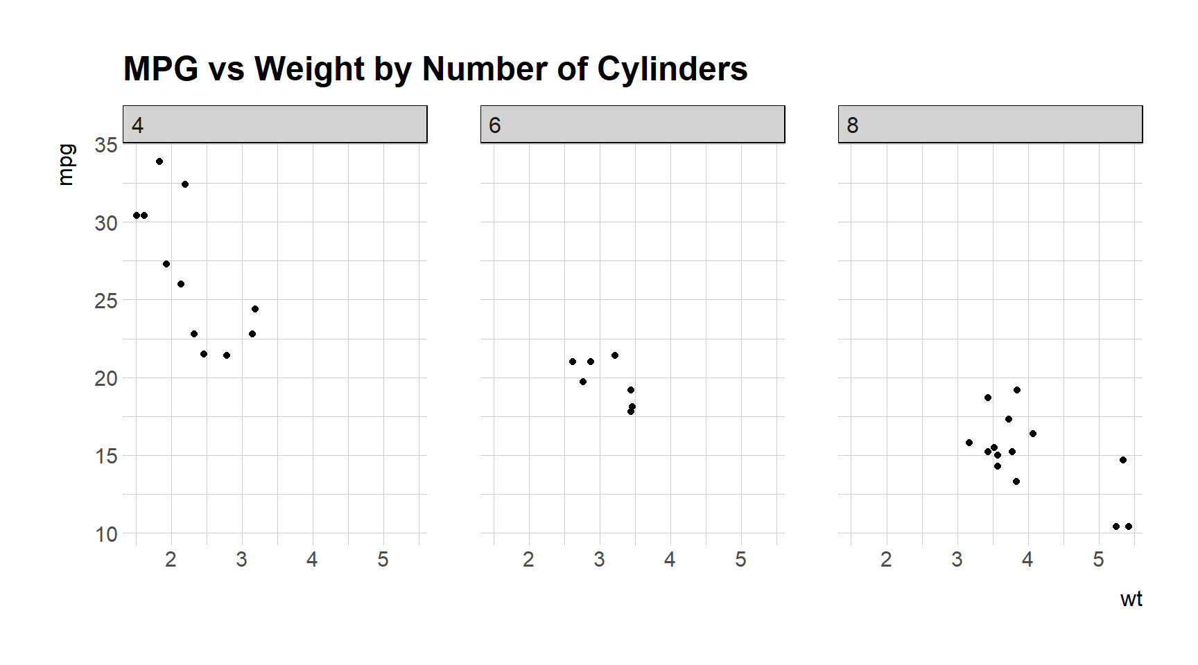 This splits the data into subsets based on the number of cylinders and creates a scatter plot for each subset.